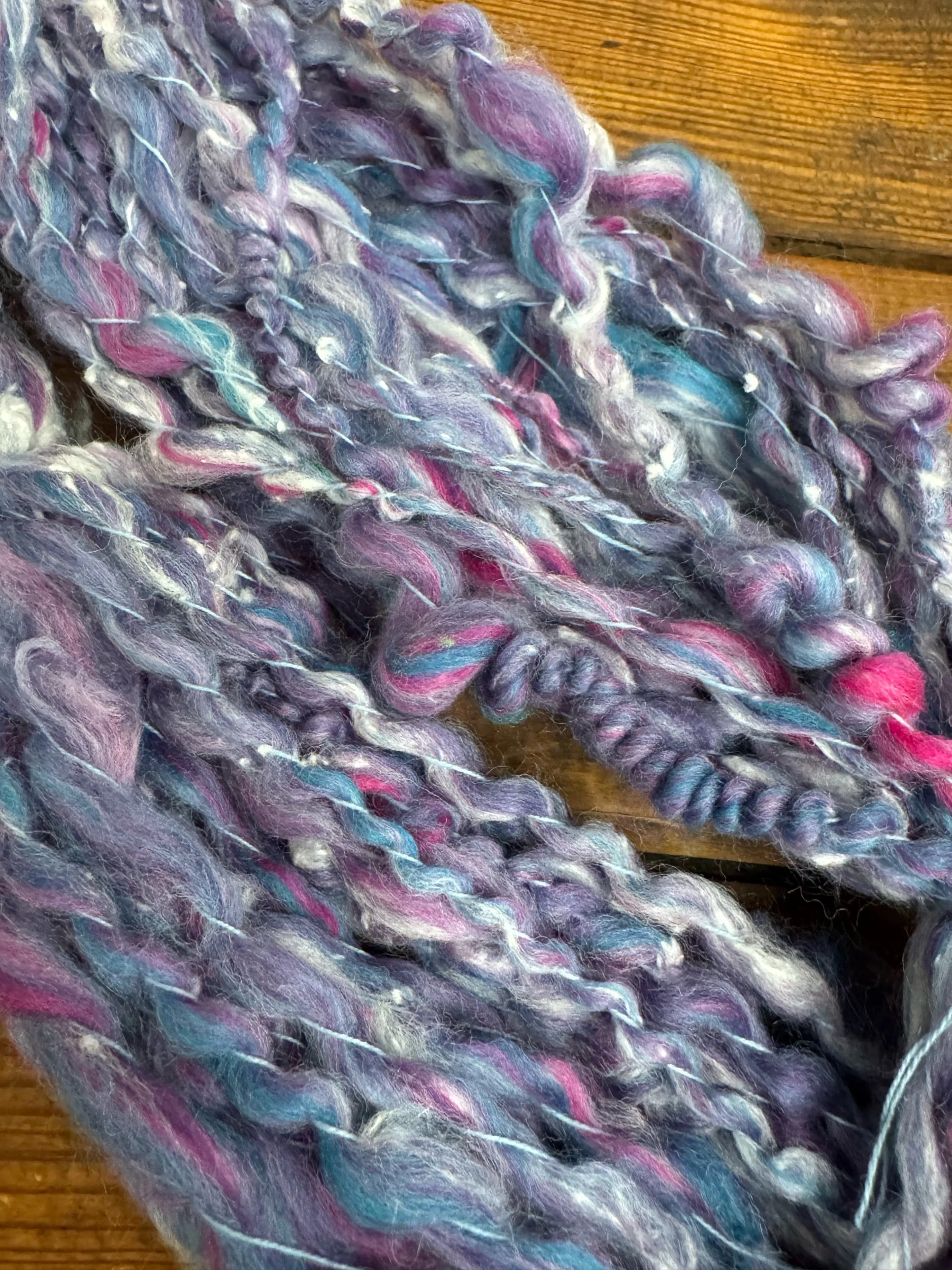 While the colorway can be revisited, the nature of this art yarn means each skein is truly one of a kind.